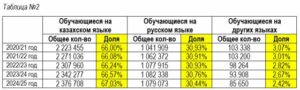 «В целом количество детей казахской национальности в организациях образования составляет 2 815 736 (80,8%), в том числе обучаются в школах с русским языком обучения 472 026 (16,8 %). Это все еще показывает, что родители не делают выбор в пользу того, чтобы их дети учились на своем родном языке», – признаёт языковая концепция (2023 г.).