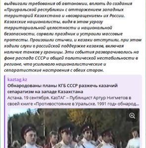 Для этого провластные СМИ делают целенаправленные вбросы о «заговоре» КГБ СССР 1991 года, чтобы оправдать такой курс «социальной деколонизации» и заодно разыграть национальную карту, бросив тень на казаков и русских, которые исподволь обвиняются в том, что были тогда инструментом «сепаратизма» Москвы.